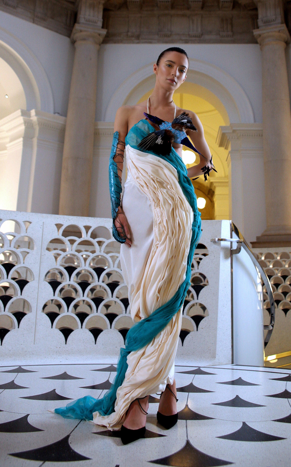 “Master’s Note. Collection II: Rohini Shaman. A ritualistic exploration of lunar growth and the sacred feminine. Captured within the halls of classical antiquity, this collection utilizes draped silks and organic, bird-like motifs to represent the Shamanic journey—a synthesis of ancient spirit and modern sculptural form.”