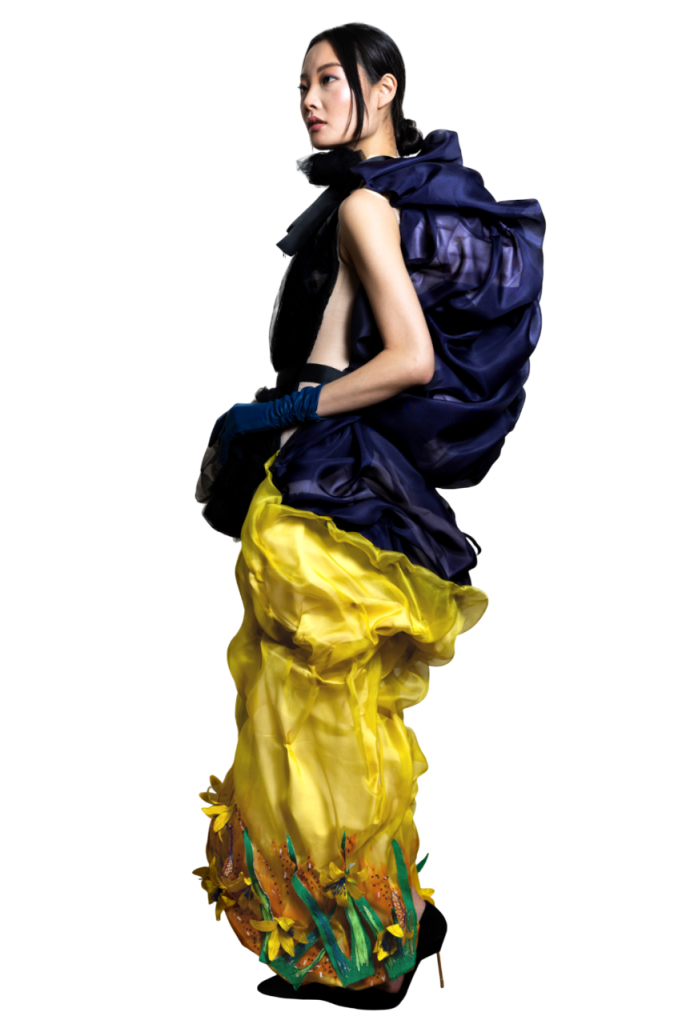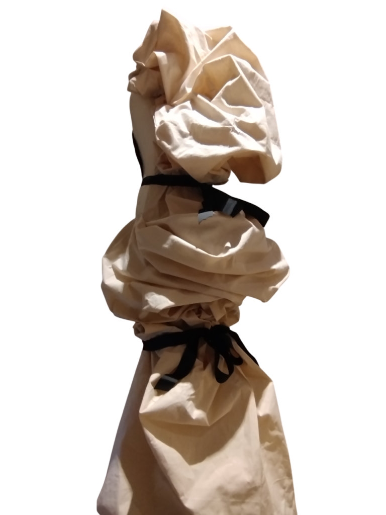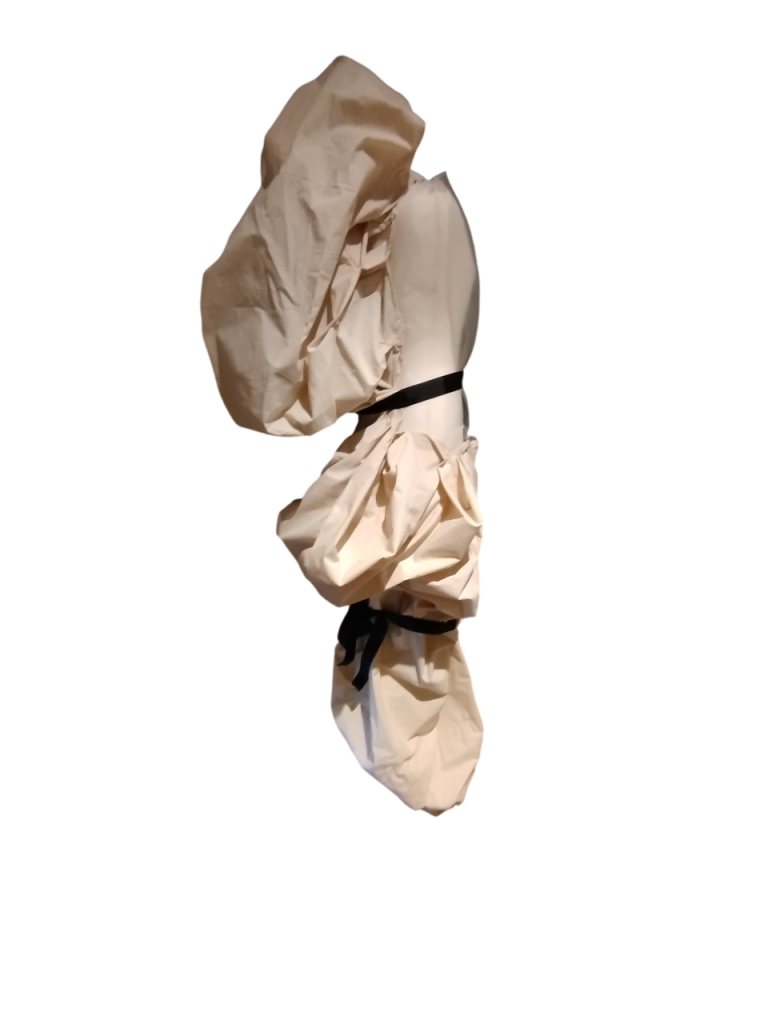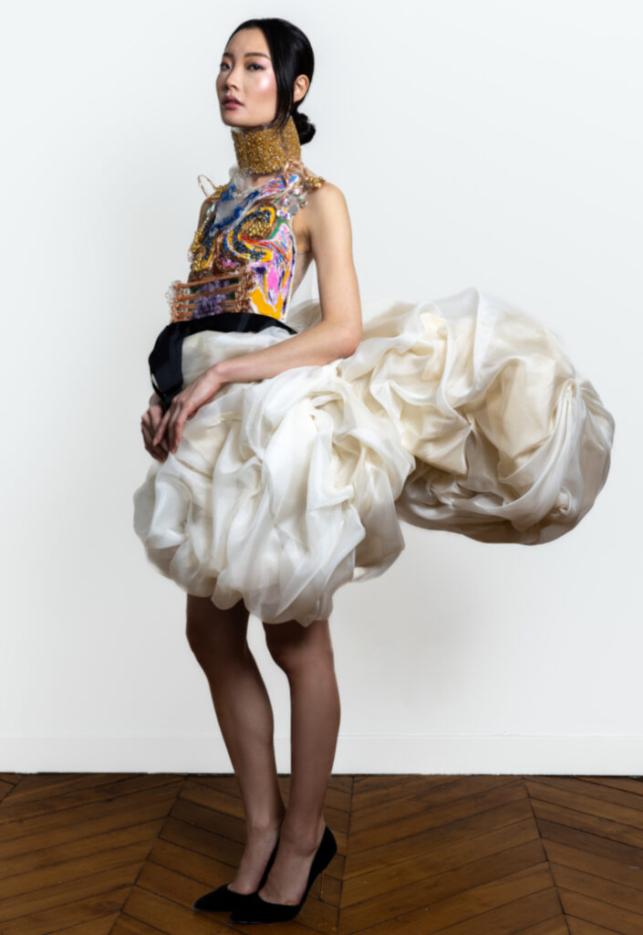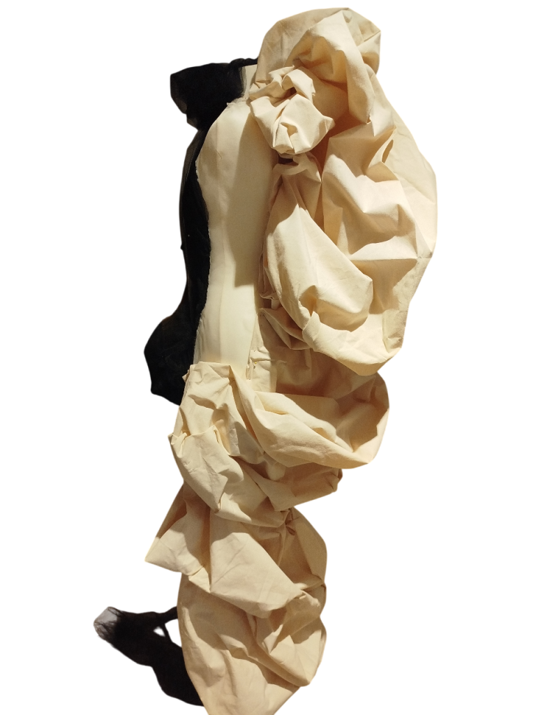 By draping these delicate fabrics over the raw, crumpled exoskeleton, the internal structure is exposed—visible beneath the surface. This transparency invites the viewer to witness the process, the tension, and the craftsmanship. The play of light and shadow across the exposed understructure becomes an integral part of the garment’s visual language, transforming it into a living sculpture.